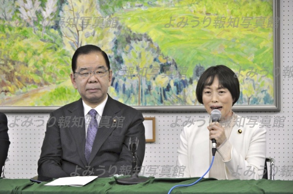 共産党大会終了後に記者会見に応じる志位和夫議長(左)と田村智子委員長